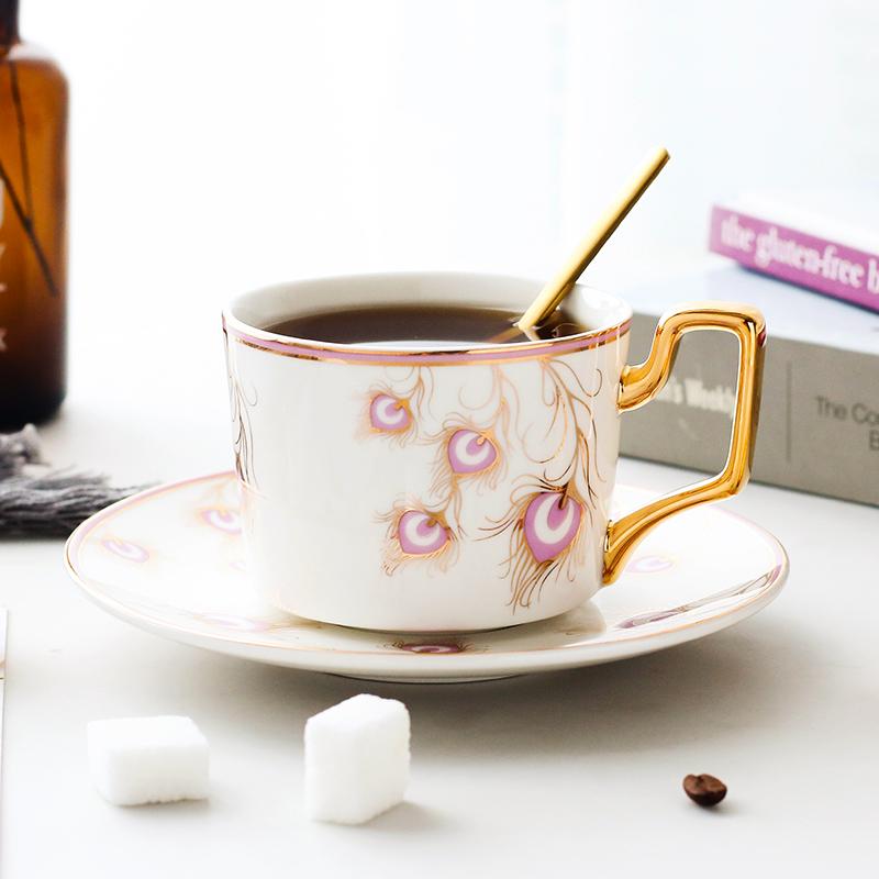 British Tea Cups, Coffee Cups with Gold Trim and Gift Box, Peacock Tail Pattern Porcelain Coffee Cups, Tea Cup and Saucer