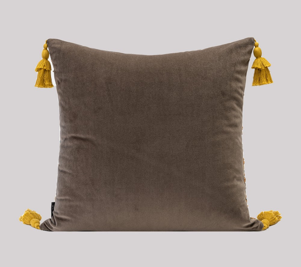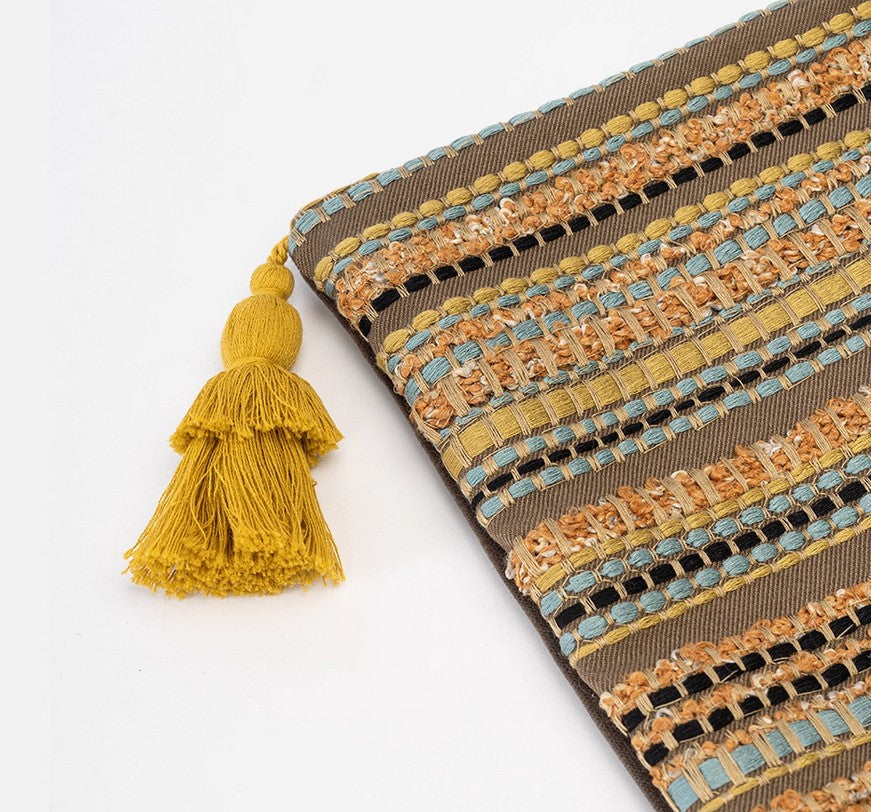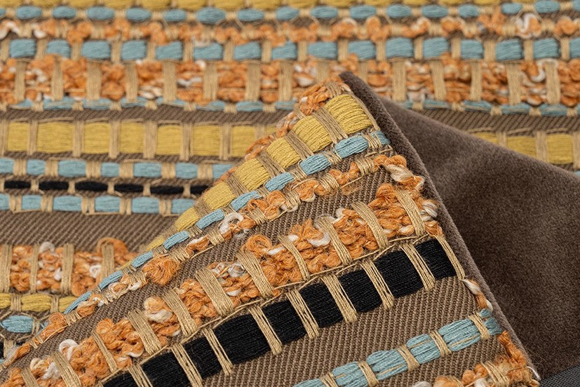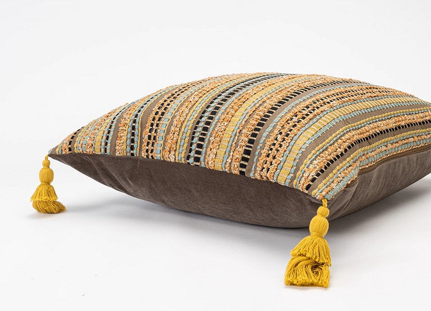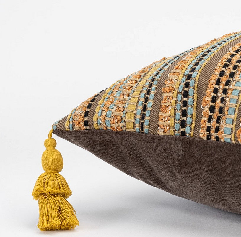 This cushion, a vibrant tapestry of warm earthy tones, weaves together rich maroon, amber, and terracotta hues in intricate striped patterns. Its soft, inviting texture invites you to sink into comfort, while its bold design transforms any space into a cozy, artistic haven.