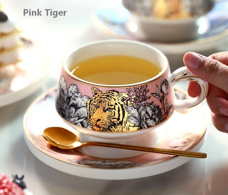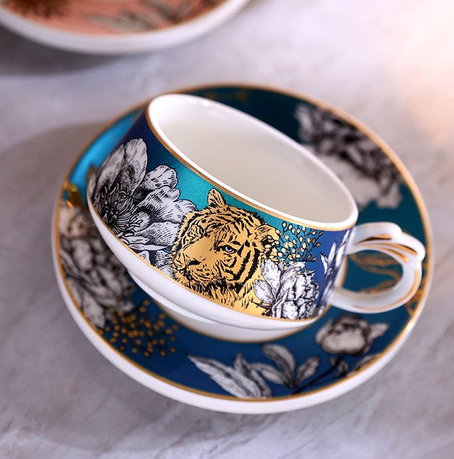 Unique Ceramic Cups with Gold Trim and Gift Box, Creative Ceramic Tea Cup and Saucer, Jungle Tiger Cheetah Porcelain Coffee Cups