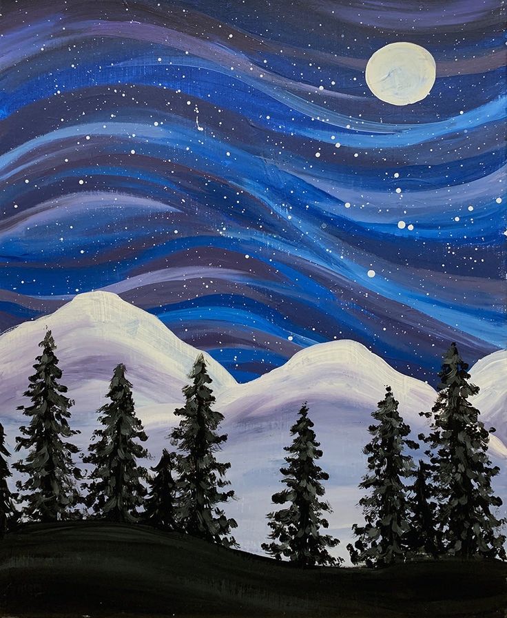 Small Canvas Artwork, Simple Small Winter Forest Night Moon Painting, Easy Painting Ideas on Canvas, Simple Acrylic Paintings, Simple Landscape Art on Canvas