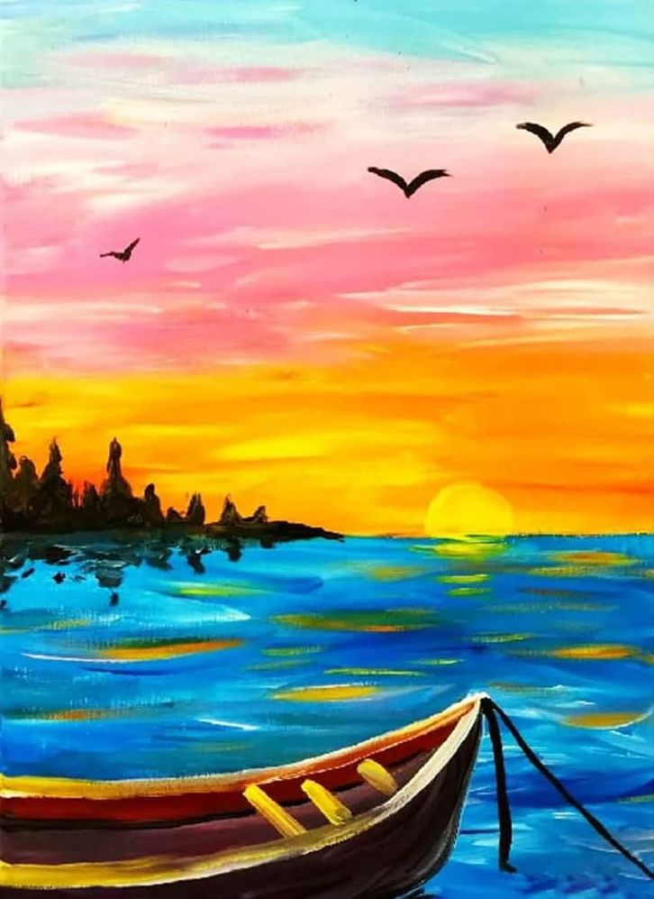 Small Boat Sunset Painting, Simple Landscape Artwork, Easy Hand Paitned Canvas Art on Canvas, Simple Painting Ideas on Canvas, Easy Acrylic Painting Ideas
