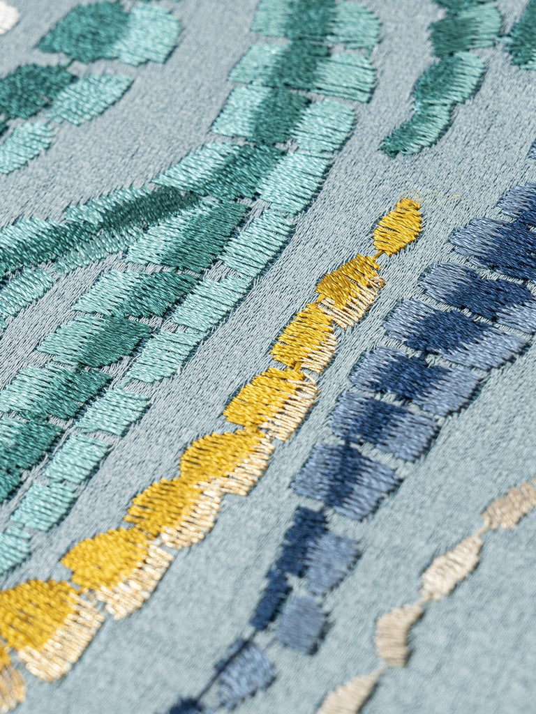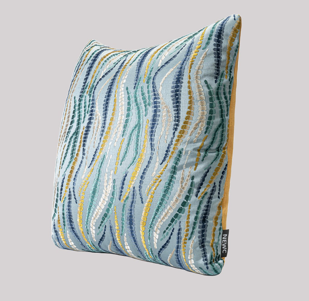 This cushion, with its light blue base and vibrant, flowing patterns of green, gold, and white, is a breath of fresh air for any space. The intricate embroidery mimics the graceful dance of willow branches, infusing the room with a serene, natural charm. Soft to the touch and brimming with artistic flair, it effortlessly elevates your home’s aesthetic, turning every corner into a cozy, visually delightful retreat.