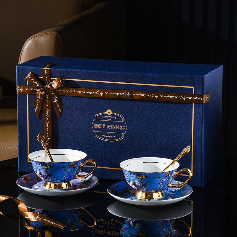 Blue Bird and Butterfly Porcelain Tea Cup Saucer Set, 7.4 oz British Tea Cup and Saucer in Gift Box, Elegant British Ceramic Coffee Cups