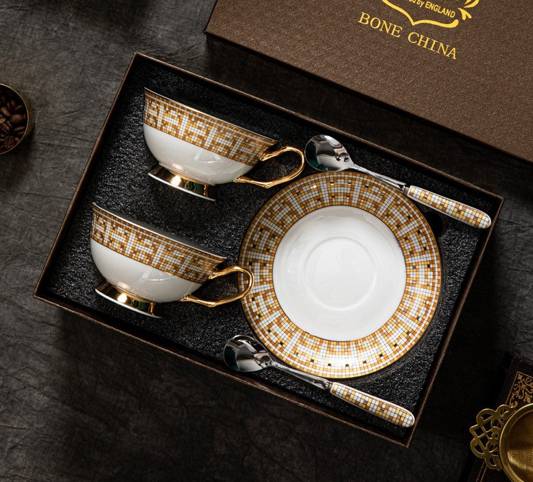 Handmade Elegant British Ceramic Coffee Cups, 6.8 oz Tea Cup and Saucer in Gift Box, Porcelain Tea Cup Set for Office, Yellow Ceramic Cups